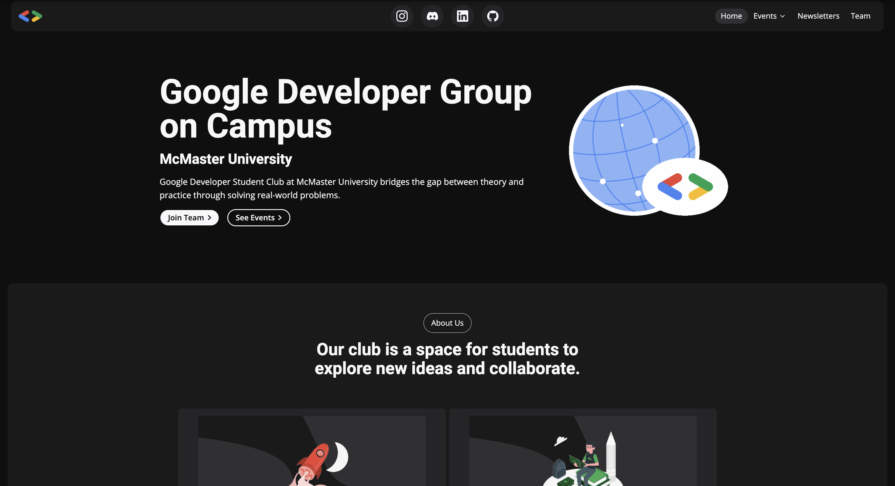 The official site for McMaster's Google Developer Student Club (GDSC). Developed in NextJS alongside a team of Software Developers on the GDSC's Marketing & Branding Team.